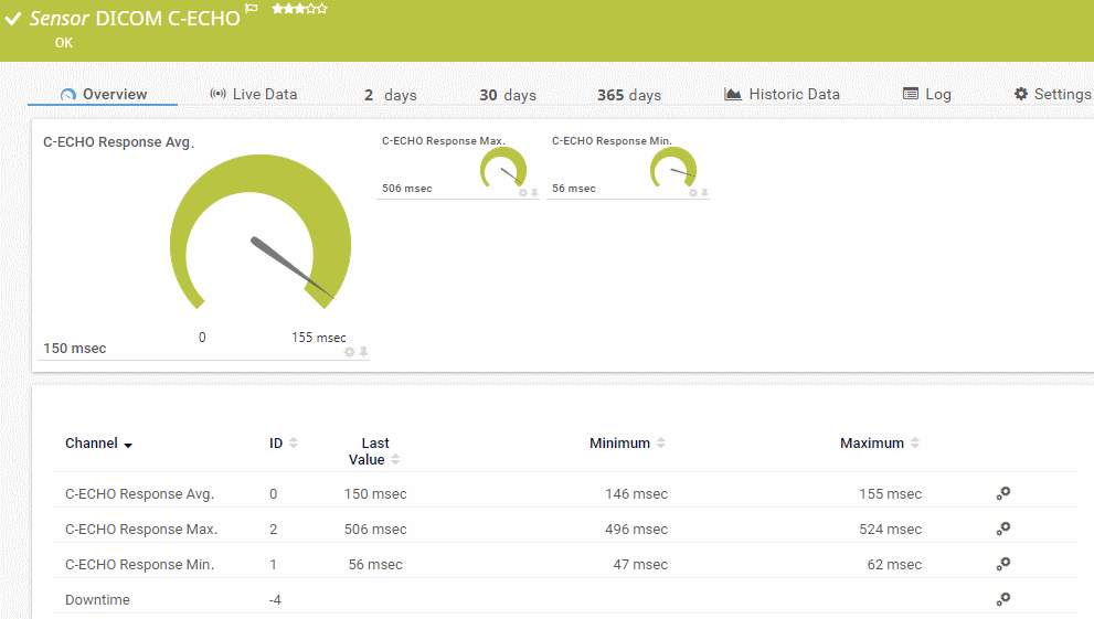 The DICOM C-ECHO sensor monitors the availability of Digital Imaging and Communications in Medicine (DICOM) capable systems and devices by sending C-ECHO requests to the target system. C-ECHO is also known as DICOM-Ping.