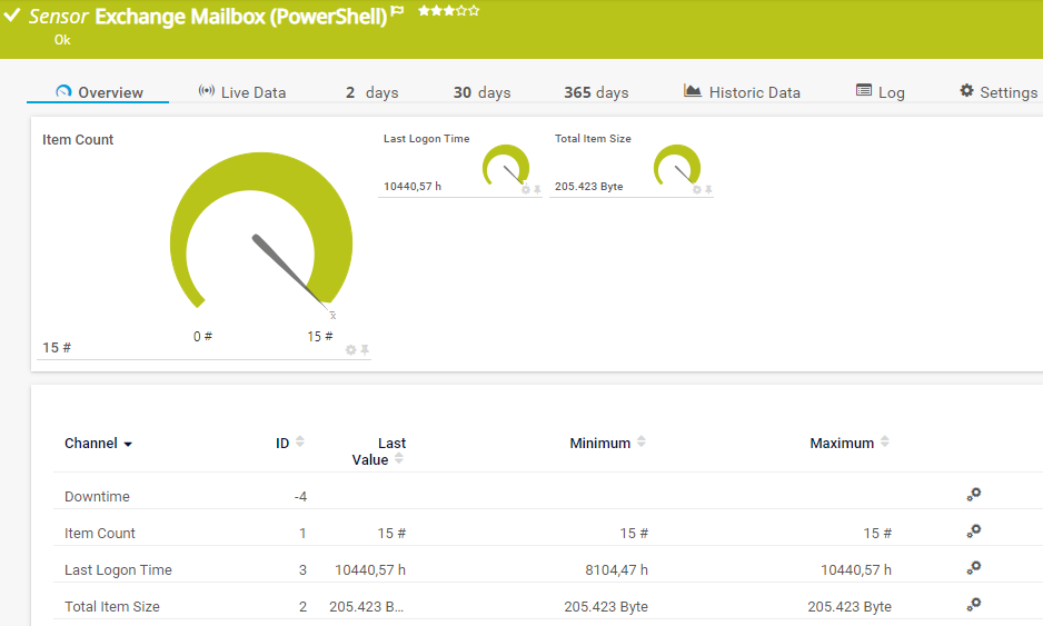 The Exchange Mailbox (PowerShell) sensor monitors mailboxes of an Exchange server via Remote PowerShell.