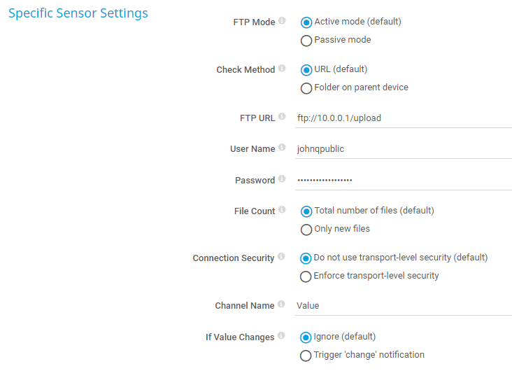 The FTP Server File Count sensor logs in to a File Transfer Protocol (FTP) server and can monitor changes to files.