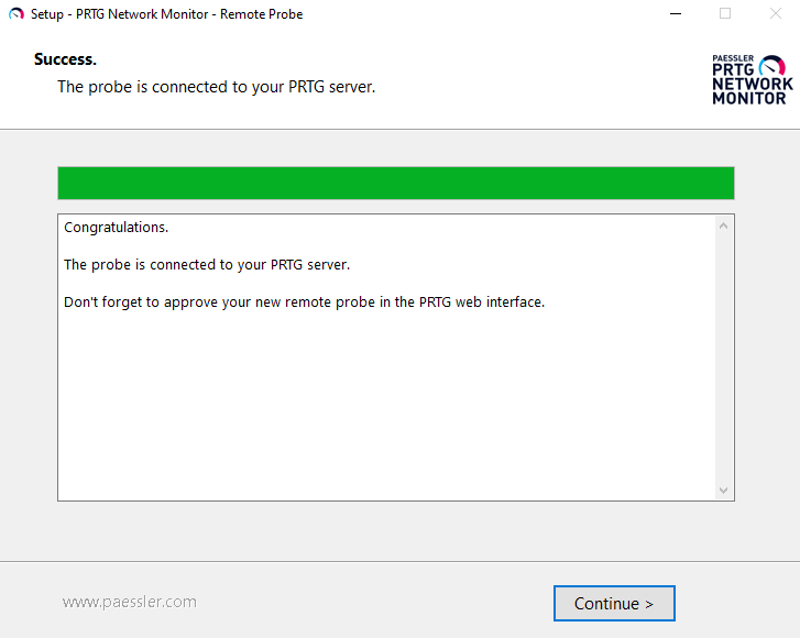 Wait until the installation is completed. The classic remote probe then automatically connects to your PRTG core server.