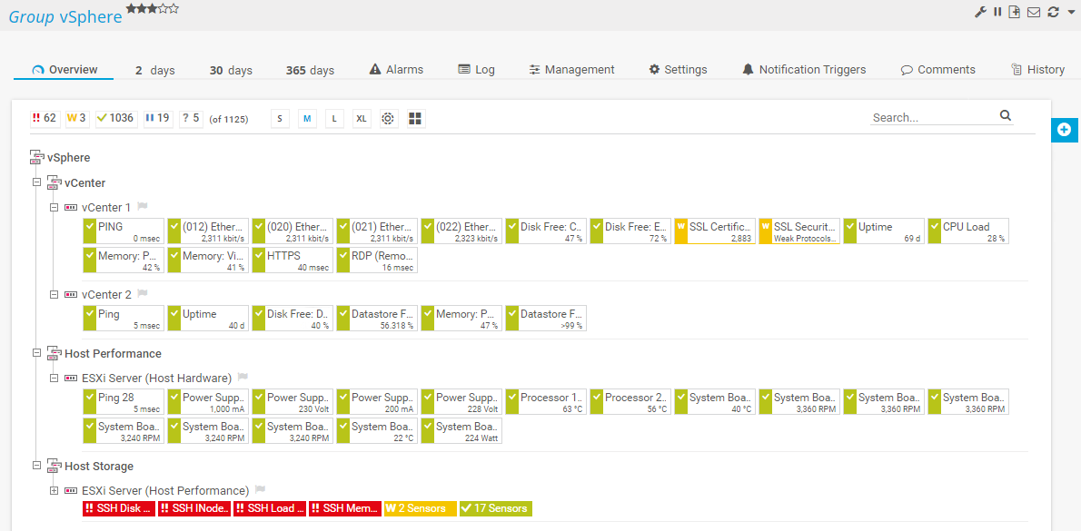 This screenshot shows an example of a vSphere group. As recommended, the sensors for the VMware virtual machines are added to the vCenter 1 device. There is also a dedicated vCenter 2 device for the vCenter Windows operating system with common WMI sensors for CPU, memory, disk, and network usage. The ESXi host servers are organized in their own groups regarding performance and storage. In this example, PRTG monitors the hosts with the standard SNMP hardware sensors as well as with the specific VMware ESXi host sensors.