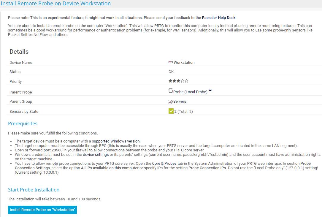 Note that installing a remote probe directly from the device tree in the PRTG web interface is an experimental feature. This approach might not be possible in all situations.