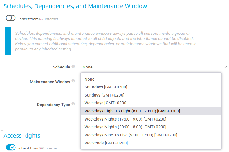 With schedules, you can specify active and inactive time spans for monitoring. For example, you can choose to monitor only on Sundays between 16:00 and 20:00. If you use scheduling, PRTG automatically pauses specific objects outside of the scheduled active times. A sensor in the Paused status does not collect monitoring data, does not change its status, and does not trigger any notifications. You can also pause monitoring for planned system maintenance windows to avoid false alarms. You can apply different schedules to every object. PRTG also uses schedules for reports and notifications.