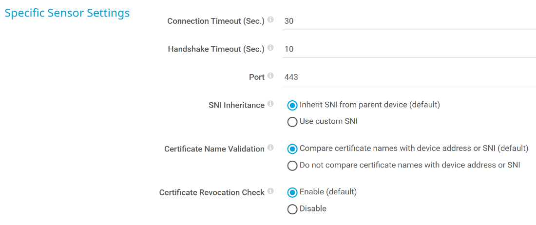 Use custom SNI: Use this setting if the device that the sensor queries has multiple certificates with the same IP address and port combination.
